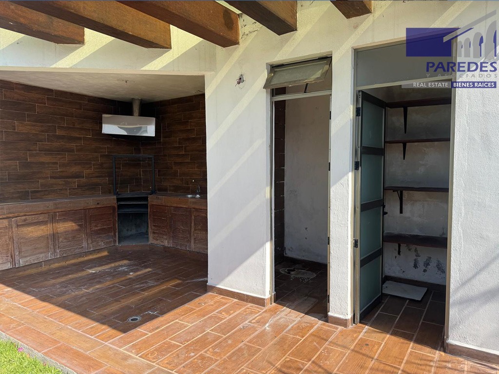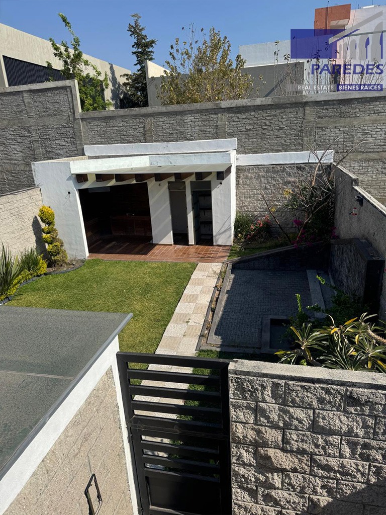 PLANTA BAJA: Garaje para dos autos, sala, comedor, medio baño, cocina, área de servicio y jardín con fuente y cascada, medio baño y pequeño espacio para bodega de jardín.