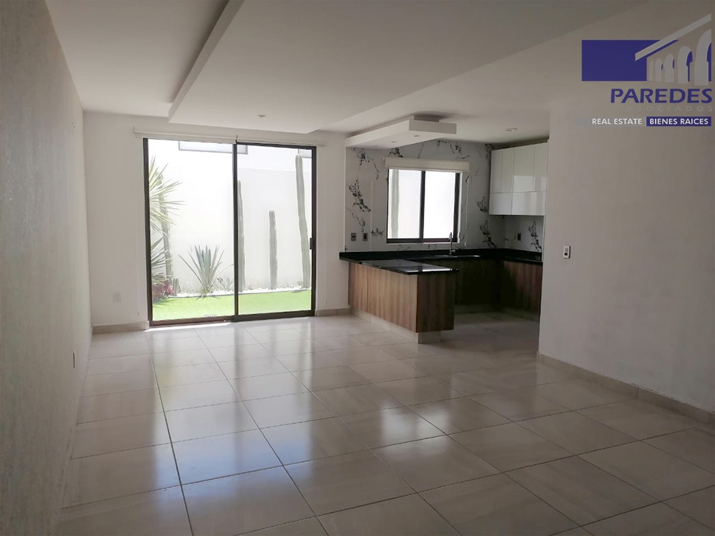 PLANTA BAJA: Cochera para 2 autos, sala, ½ baño, comedor, cocina integral con barra desayunadora, espacio para alacena, área de servicio, patio trasero.